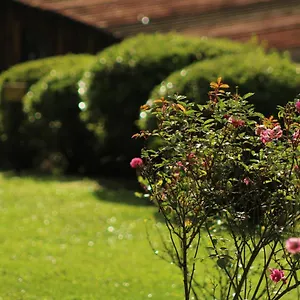 Chalé inclui 7 quartos com pátio, frigobar e mesa de trabalho. O banheiro está equipado com banheira, banheiro separado e chuveiro que estão à disposição dos hóspedes.